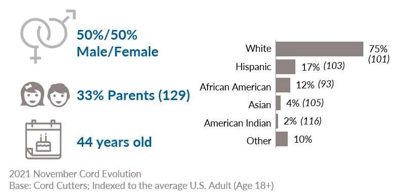 Demographically, Cord Cutters are evenly split at 50% each for male and female. One-third are parents, the mean age of this group is 44 years, and their household income is slightly higher than average.