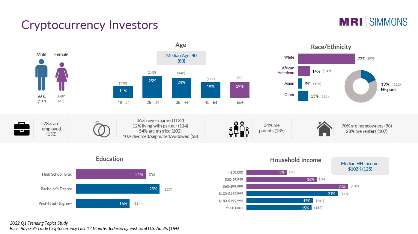 So, what do we know about crypto investors? We know they are a desirable audience: They skew male, single, highly educated, and affluent, with a median age of 40 and a median household income of $102K. While they enjoy a variety of leisure activities, crypto investors are more likely than the average American to participate in fantasy sports leagues (Index: 155), play console video/electronic games (Index: 147), and play in or attend e-sports events (Index: 149/160).