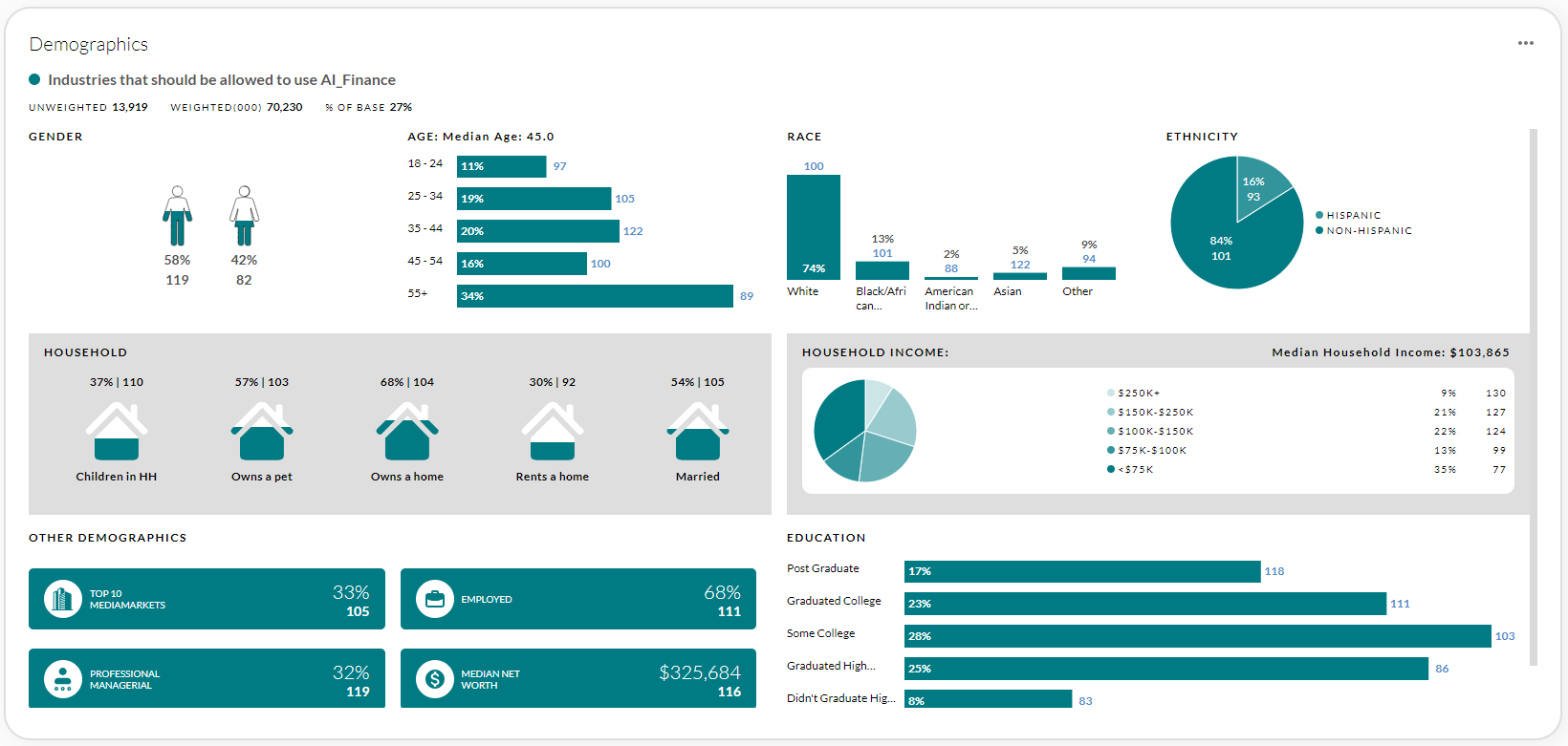 Given the promises of AI and its growing adoption within the financial services space, let's take a deeper dive into those adults who approve of the use of AI in the financial services industry. We can see that they are more likely to have a higher household income, be employed (especially in professional/managerial positions), with above average education, net worth, and home ownership -- overall a valuable and lucrative segment to target through activation.